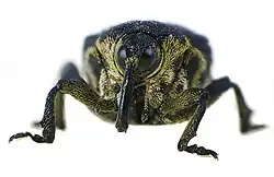 Der Rüssel ist mittellang, dünn und mäßig nach unten gebogen. Er kann in eine Vertiefung zwischen den weit voneinander getrennten Vorderhüften eingelegt werden (Abb. 3). Die Furche zur Aufnahme des Rüssels ist scharf begrenzt und erstreckt sich über Vorder- und Mittelbrust. Der vordere Teil fällt besonders auf, da die helle Beschuppung rechts und links unterbrochen ist. Die zwölfgliedrigen Fühler sind auf halber Rüssellänge seitlich eingelenkt. Sie sind kurz, dünn und spärlich behaart. Das erste Glied (Schaftglied) ist für die Unterfamilie relativ kurz. Es kann in die Fühlergrube eingelegt werden, die auf dem Rüssel seitlich von der Einlenkungsstelle der Fühler zum vorderen unteren Augenrand hin verläuft. Das erste Glied der Geißel ist lang und kegel- bis birnenförmig, länger und stärker als die folgenden sechs Geißelglieder. Das zweite Geißelglied ist etwa gleich lang wie das erste, aber deutlich schlanker. Die folgenden vier Geißelglieder sind merkbar kürzer. Die letzten vier Fühlerglieder sind zu einer kompakten und zugespitzten Keule mit einem winzigen letzten Glied verschmolzen. Die Augen sind gerundet und wenig gewölbt. Die Stirn ist eingedrückt, in Stirnhöhe liegen die Ränder der Augen entsprechend höher als die Kopfmitte (Abb. 4 und 5).