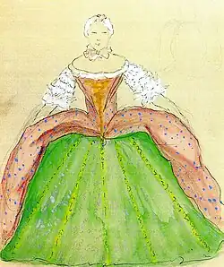 Bei der Darstellung handelt es sich um eine weibliche Figurine der Werefkin. Sie zeigt einen Kostümentwurf für eine Schauspielerin, die in einem Bühnenstück des 17. oder 18. Jahrhunderts auftrat. Bekleidet ist sie mit einem rosafarbenen Oberteil mit großem Dekolleté und bis zu den Ellenbogen reichenden Ärmeln, die mit Fransen geschmückt sind. Eine Wespentaille führt über zum weit ausladenden Panier à coudes. Der Rock reicht bis zum Boden, die Füße sind bedeckt.