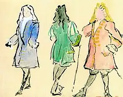 Bei so viel Vertrautheit mit der Bühnenkunst, wäre es verwunderlich, wenn nicht weitere Belege von praktischen Arbeiten der Werefkin in diesem Metier auf uns gekommen wären. Was dies anbetrifft, so kennt man ein Blatt mit drei männlichen Figurinen mit Perücken, die im Stil und der Farbigkeit gut zu der genannten weiblichen Figurine mit dem Reifrock passen.