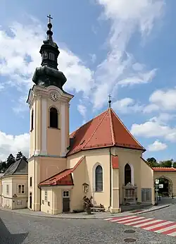 Der Sakralbau wurde ursprünglich von 1403 bis 1407 als Kapelle mit einem 3-jochigen Langhaus und einer ostseitigen polygonaler Apsis im gotischen Stil errichtet. 1686 erfolgte ein 2-jochiger barocker Anbau im Westen. 1717 wurde eine neue Sakristei südseitig angebaut – die alte nordseitige dient heute als Beichtkapelle – und der baufällige Turm durch einen neuen ersetzt. Der jetzige Glockenturm mit dem Zwiebelhelm wurde 1831 nach den Plänen des Stifts- und Stadtbaumeister Ignaz Decherbauer errichtet.
