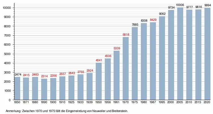 Die Einwohnerzahlen sind Volkszählungsergebnisse (rot gekennzeichnet) oder amtliche Fortschreibungen des Statistischen Landesamts (nur Hauptwohnsitze). Alle Zahlen ab 1871 stammen vom Statistischen Landesamt Baden-Württemberg,[8] 1850 aus der Beschreibung des Oberamts Böblingen.[6]