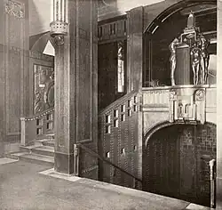 Eine zweiläufige Treppenanlage leitete zum tiefer gelegenen Pfeilersaal im Hauptbau über, in den sie prägend in die Mitte der Längsseite hineinragte. Auf dem Podest der Treppenanlage und von beiden Seiten gut sichtbar erhob sich als „Prunkstück der Anlage“,[26] als „Hauptsinnbild des Hauses“,[43] der Rheingoldbrunnen. Der Bildhauer Franz Metzner modellierte die drei auf dem Rand einer grünen Marmorschale stehenden Rheintöchter, die in den erhobenen Händen den Nibelungenhort tragen. Wie andere Arbeiten Metzners bewegten sich seine Nixen fern gängiger akademischer Schönheitsideale nach der Jahrhundertwende. Der Kritiker Maximilian Rapsilber attestierte den „kühlherzigen, herben, eckigen Nixen“ eine „wahrhaft abschreckende Hoheit, also dass kein Sterblicher ein Gelüsten nach ihnen hegen würde“.[46] Der Guss der Bronzestatuen erfolgte durch die Gießerei G. Knodt in Frankfurt am Main.