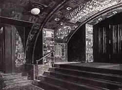 Das Vestibül erstreckte sich über alle drei durch das Weinhaus genutzte Geschosse im Vorderhaus an der Potsdamer Straße. Den Besuchern bot es mehrere Möglichkeiten in die Säle des Weinhauses zu gelangen. Neuartig in Berlin war die bereits bei der Beschreibung der Fassade erwähnte Doppel-Fahrstuhlanlage, geliefert von der Maschinenfabrik Carl Flohr in Berlin, die die Gäste direkt von der Straße in die beiden oberen Geschosse beförderte.[37][38] Betraten die Besucher das Haus durch die Drehtür, erschloss eine elegant geschwungene Treppenanlage die oberen Geschosse. Ein Mosaikboden bedeckte den Fußboden im Erdgeschoss, Wände und Treppe waren mit Nussholz verkleidet und durch helleres Holz in Quadrate gegliedert.[39]
