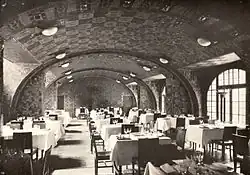 Im Garderobengeschoss, wo die Treppenläufe endeten, nahm die Rotunde ein Restaurant auf. In Anlehnung an die Gestaltung des angrenzenden „Ebenholzsaales“ im Trakt an der Potsdamer Straße erhielt der 3,6 Meter hohe Raum Wände aus Ebenholz. Die silbergraue Decke überzog ein Muster aus leicht mit Farbe gehöhtem Kammputz.[49] In Richtung Bellevuestraße schloss sich der „Bankettsaal“ an. Zwei Fenster beleuchteten den geradezu „ernst, monumental“[49] wirkenden Raum.