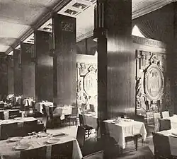 Zwischen den äußeren Pfeilerreihen und den Außenwänden trennten 3,2 Meter hohe Holzpaneele kojenartige Bereiche ab. Pfeiler und Wände bekleidete tiefbraunes Palisanderholz, stellenweise mit schmückenden Einlagen anderer exotischer Hölzer.[23] Diese Kunsttischlerarbeiten lieferte die Firma Kimbel & Friederichsen, Hoflieferant des Kaisers. Die „meisterlichen Schnitzereien“ in den Kojenwänden, die „bacchische Motive enthalten“,[23] wie auch die Bronzereliefs an den Pfeilern schuf der Bildhauer Hermann Feuerhahn. Vom tiefen Braun des Holzes hob sich die hellgrau getupfte Putzdecke wirkungsvoll ab.[24] Die großen Fenster gegen die Terrasse erhellten den Raum und ließen sich im Sommer im Boden versenken. Bei Dunkelheit erzeugten Wandleuchter in Kerzenform und Glühlampenreihen an der Decke „eine verschwenderische Lichtflut“.[24]