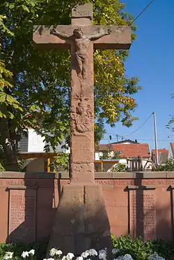 Ursprünglich stand das Kreuz beim westlichen Ortsausgang, am alten Weg nach Dirmstein, wo es noch 1615 der Inschriftensammler und Historiker Georg Helwich vorfand und in seinem Werk Syntagma Monumentorum et Epitaphiorum (Liste der Denkmäler und Grabinschriften) beschrieb. Versetzt an den heutigen Platz in der Weinsheimer Hauptstraße wurde es laut inzwischen nicht mehr erkennbarer Zusatzinschrift (rückseitig) im Jahre 1783. Es ist an dieser exponierten Stelle ortsbildprägend und wurde integriert in ein Denkmal für die Gefallenen des Zweiten Weltkriegs; als ausgewiesenes Kulturdenkmal steht es unter Denkmalschutz.