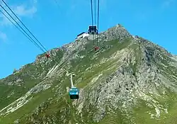 1955/56 entstand für rund 2,8 Mio. Schweizer Franken die vom Bahnhof Arosa aus startende, in zwei Sektionen über die 2013 m hohe Mittelstation bei der Sattelalp auf den Weisshorngipfel führende Luftseilbahn Arosa–Weisshorn (LAW/Weisshornbahn).[13] Die von der Firma Von Roll erstellte Anlage war damals die grösste und schnellste (Sektion 2: 10 m/s) Luftseilbahn der Schweiz.[14][15][16][17][18] Gleichzeitig erfolgte die Eröffnung des Bergrestaurants Weisshorngipfel unmittelbar neben der Bergstation.[19] Am 27. November 1967 ereignete sich während einer Revidierung des Hauptantriebs ein Unglück mit einer Hilfskabine, bei dem alle sechs Insassen ums Leben kamen.[20][21][22] 1984 erstellten die Schweizerischen Post-, Telefon- und Telegraphenbetriebe (PTT) auf dem Weisshorngipfel die von Norden und Nordwesten gut sichtbare Richtstrahlstation. Die LAW wurde 1992 nach 35 Betriebsjahren grundlegend modernisiert. Die Kabinen fassen seither je 100 Personen (1. Sektion) bzw. 125 Personen (2. Sektion).[23]
