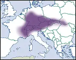 Das Verbreitungsgebiet erstreckt sich von den Westalpen zu den Ost- und Südalpen bis nach Tschechien, Slowakei, Südpolen und die Westukraine. Im Norden reicht es bis etwa zu den deutschen Mittelgebirgen Harz und Teutoburger Wald; einzelne Vorkommen sind auch aus Belgien und den Niederlanden bekannt.