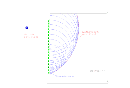 Der Ausgangspunkt der synthetisierten Wellenfront kann dann jeder beliebige Punkt innerhalb der horizontalen Ebene der Lautsprecher sein. Er repräsentiert die virtuelle akustische Quelle, die sich in ihrem Verhalten kaum von einer realen akustischen Quelle an ihrer Position unterscheidet. Sie scheint sich nicht mehr mitzubewegen, wenn sich der Zuhörer im Abhörraum bewegt. Konvexe oder auch konkave Wellenfronten können erzeugt werden, die virtuelle Schallquelle kann sich auch innerhalb der Lautsprecheranordnung befinden und sie wird sogar „umgehbar“.