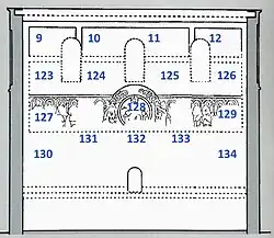 Der Zyklus der Westwand bestand ursprünglich aus sechzehn einzelnen in vier Reihen nach Themen angeordneten Bildern. Oberste Reihe: Altes Testament, zweite Reihe: Wiederkunft Christi, dritte Reihe: Jüngstes Gericht mit Christus in der Mitte, vierte Reihe: Erlöste und Verdammte.[4]