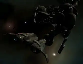 Vega Strike, eine aktuelle, freie 3D-Weltraumsimulation: ein Raumschiff der Llama-Klasse dockt an eine Minenbasis an (Stand 2008)