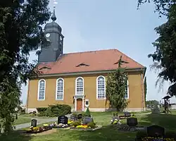 Einem Großbrand infolge Blitzschlag[13] im Rittergutsgelände am 16. Februar 1833 fiel auch die damalige Kirche zum Opfer. Da der Kirchbau bereits 1632[8] durch einen Brand in Mitleidenschaft gezogen wurde, wählte man einen neuen, etwas abseits des Ortes gelegenen Standort auf dem Schäferfeld des Rittergutes. Grund und Boden erwarb die Kirchgemeinde durch Gebietstausch mit dem Rittergut.[15] Nach nur einjähriger Bauzeit konnte am 23. November 1834 Kirchweih gefeiert werden. Die Gesamtkosten beliefen sich auf 4117 Taler. Als Baumeister werden Ratszimmermeister Christian Friedrich Preußler sowie Amtsmaurermeister Karl August Hofmann aus Nossen genannt.[13] Der Gesamtaufriss des Baus ist bis heute unverändert, lediglich die Ausmalung wurde anlässlich der 50-Jahr-Feier 1884 auf Betreiben der Patronin Freifrau von Wöhrmann umfassend erneuert. 1898 erhielt die Kirche eine Heizmöglichkeit durch einen so genannten Wasseralfinger Ofen. 1998 wurde eine elektrische Heizung eingebaut, ein Jahr darauf wurde der Innenraum neu gestrichen. Der Kanzelaltar wurde 1884 von Woldemar Kandler neu gestaltet. Die Orgel entstammt der Werkstatt Müller/Reiß aus Neugersdorf, 1905 wurde sie durch Orgelbaumeister G. H. Schäfer aus Freiberg umdisponiert, 2007 erfolgte eine Generalüberholung. Die drei Glocken wurden 1834 gegossen, die kleine Glocke wurde vom Königlich-Sächsischen Stückgießer Johann Gotthelf Große aus Dresden gegossen. Die vom Dresdner Kunstglaser Bruno Urban gestalteten Buntglasfenster stammen aus den Jahren 1888/89 und wurden 2003 restauriert. Die übrigen Kirchenfenster wurden im Jahr 2000 gänzlich neu geschaffen.[16]