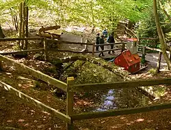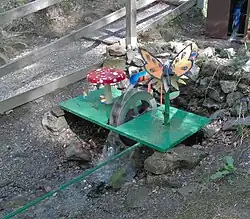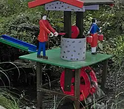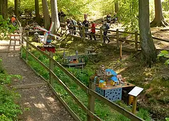 Bei den Wasserrädern wurden eine Schutzhütte, Sitzgelegenheiten und ein immer wieder reparaturbedürftiges großes Schaukelpferd aufgebaut. Der Bachlauf ist mit einem einfachen Holzgeländer umzäunt.