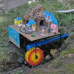 Das Straßenbahnmodell stammt aus den späten 1970er Jahren und zeigte ein Fahrzeug der Deisterlinie 10 der Hannoverschen Verkehrsbetriebe üstra.[27][42][47] Es war mit einem Gewicht von knapp 150 Kilogramm das schwerste der Wennigser Wasserräder.[15][48] Im Winter 2008/09 wurde das Modell umgebaut, so dass es nun als Lummerlandmodell mit Lukas dem Lokomotivführer, der Lokomotive Emma, Jim Knopf und Alfons dem Viertel vor Zwölften sowie den Häusern von Herrn Ärmel und Frau Waas mehrere Figuren der Augsburger Puppenkiste nach dem Werk Jim Knopf und Lukas der Lokomotivführer von Michael Ende zeigt.[42][47]