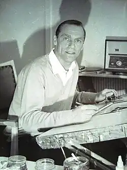 Ein Werbegrafiker in den 1960er Jahren bei seiner Arbeit (Selbstporträt Heinz Traimer).