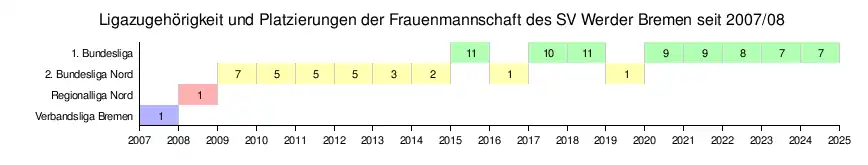 Erst Anfang des Jahres 2007 reetablierte der SV Werder eine Frauenabteilung, nachdem der Bremer Fußball-Verband den Sportverein im Herbst 2006 gebeten hatte, diese zu gründen, um die Abwanderung von talentierten Spielerinnen ins niedersächsische Umland einzudämmen.[2] Zuvor hatte es der Verein stets abgelehnt, erneut eine eigenständige Frauenfußballabteilung zu betreiben und dies mit dem Platzmangel auf dem Gelände der Pauliner Marsch gerechtfertigt.