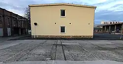 Ausgebaute Drehscheibe vor dem ehemaligen Kulturhaus, von rechts kommend das Werkbahngleis 7 (2004) -