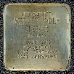Am 10. September 2018 wurden in Köln vor zwei Wohnhäusern sieben Stolpersteine im Rahmen des Kunst- und Erinnerungsprojektes des Künstlers Gunter Demnig verlegt. Die Stolpersteine erinnern an Werner Wolf Glaser und seine Frau Renate (geborene Eiser), an die Eltern Viktor und Julie Glaser (geborene Wolff) – die Mutter kam nach der Deportation 1943 im KZ Sobibor ums Leben,[2] an die Schwiegereltern Salomon und Sara Selma Eiser (geborene Isaacson) sowie an den Bruder Georg Glaser, der 1944 im Vernichtungslager Auschwitz ermordet wurde.[3]