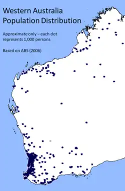 Etwa 2,3 Millionen Einwohner Western Australias leben in der Metropolitan Area Perth mit Perth und Fremantle. Der größte Teil der restlichen 800.000 Einwohner konzentriert sich auf den relativ kleinen Teil um die Südwestspitze Australiens. Die zweitgrößte Stadt Western Australias ist Bunbury mit 64.000 Einwohnern (175 Kilometer südlich von Perth).