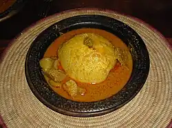 Die gängigste Beilage der westafrikanischen Küche ist Fufu, ein fester Brei aus Maniok (oder anderen stärkehaltigen Knollen) und Kochbananen. Dem Fufu verwandte Produkte sind Garri, das aus fermentiertem Mais bestehende Kenkey und Tô, wobei letzteres aus Hirse- oder Maismehl besteht.[27] In ärmeren Regionen dienen die Gerichte auch als Hauptbestandteil einer Mahlzeit und werden mit einer Soße aus Gemüsen oder Blattgemüsen serviert. Auch Brot kann als Beilage dienen; größere regionale Verbreitung erfahren das baguetteähnliche Tapalapa in Senegambia und Guinea und das Fladenbrot Ngome in Mali.
