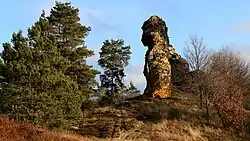 - Besonders erwähnenswert sind die Kleindenkmale preußischer Rundsockel-Meilenstein[19] am Ortsausgang an der (nicht mehr öffentlichen) Straße in Richtung Warnstedt und die Grenzversteinung gegen das Reichsstift Quedlinburg am Steinholz aus dem 18. Jahrhundert[20] sowie der Hungerstein von 1931 nördlich (nach Umsetzung 2011 westlich) des flächenhaften Naturdenkmals Königstein. An dessen Südseite befinden sich Weinberge des Harzer Weingutes Kirmann, welches zum Weinanbaugebiet Saale-Unstrut gehört.