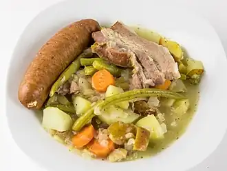 Die Zubereitung des Eintopfs kann je nach Quelle variieren. In der Regel werden zuerst fein geschnittene Zwiebeln oder Zwiebelringe mit in Scheiben geschnittenem Speck in wenig Wasser gekocht[2] oder angebraten[1], nach klassischem Rezept werden keine Zwiebeln hinzugefügt.[3][4] Danach werden grob geschnittene grüne Bohnen und eingeweichte weiße Bohnen sowie Würfel aus Kartoffeln, Karotten (gelbe Rüben) und säuerlichen und festen Äpfeln und Birnen hinzugefügt. Dem Ganzen wird Wasser oder eine Gemüsebrühe hinzugegeben und der Eintopf wird mit Salz, Pfeffer und Kräutern wie Bohnenkraut, Petersilie und Oregano gewürzt und der Eintopf wird gekocht, bis alle Bestandteile gar und die Suppe leicht sämig ist. Um die Suppe weiter zu säuern, kann (Apfel)essig verwendet werden.[3][2] Um die Sämigkeit zu erhöhen wird etwas Mehl mit kaltem Wasser verrührt und die Suppe damit angedickt.[3][5]