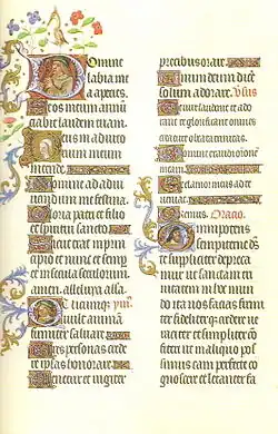 Zwei Seiten aus einem Mailänder Stundenbuch (15. Jahrhundert): Kalligrafie in Verbindung mit üppiger Buchmalerei. Auch innerhalb des Textes sind Elemente der Bildmalerei zu sehen, vor allem am Textanfang bei der Initiale.