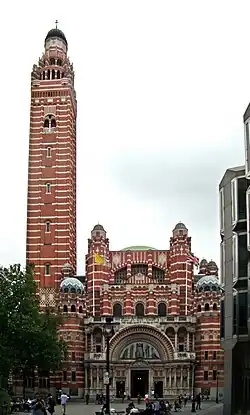 Seit das englische Königshaus die Kirche des Landes von Rom getrennt hatte (Church of England), gab es 300 Jahre lang keine römisch-katholischen Gotteshäuser in England. Erst im 19. Jahrhundert etablierten sich wieder legale römisch-katholische Gemeinden. Dem Apostolischen Vikariat London diente seit 1790 die unter bayerischem Schutz stehende Warwick Street Church als behelfsmäßige Bischofskirche.[1] Nach der Wiederherstellung der katholischen Hierarchie in England und Wales 1850 wurde 1869 Our Lady of Victories in Kensington zur Prokathedrale.[2] Mit den Spendensammlungen für den Bau einer neuen, repräsentativen Kathedrale begann schon der erste Erzbischof von Westminster Nicholas Wiseman (1802–1865). Doch erst 1895 konnten die Arbeiten begonnen werden. Eröffnet wurde die Kathedrale im Jahr 1903.