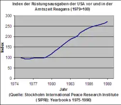 Das Wettrüsten beziehungsweise die Rüstungsspirale wurde üblicherweise damit gerechtfertigt, dass die eigene Seite jeweils weiter aufrüsten müsse, da die andere Seite dies auch tue und eine Überlegenheit anstrebe. Ronald Reagan betrieb das Wettrüsten mit dem erklärten Ziel, den kommunistischen Block wirtschaftlich in die Knie zu zwingen. Aufsehen erregte besonders seine Ankündigung des SDI-Projektes im Jahre 1983, hinter der die Zielvorstellung einer strategischen Unverwundbarkeit der USA gegen eventuelle sowjetische Angriffe deutlich erkennbar war. In einer bereits durch Afghanistankrieg und NATO-Doppelbeschluss seit 1979 erneut verschärften Blockkonfrontation zeichnete sich damit allmählich die angestrebte Überforderung der östlichen Führungsmacht und ihrer Satellitenstaaten ab.