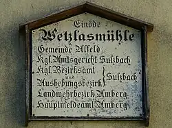 Durch die zu Beginn des 19. Jahrhunderts im Königreich Bayern durchgeführten Verwaltungsreformen wurde der Ort mit dem zweiten Gemeindeedikt zu einem Bestandteil der eigenständigen Landgemeinde Alfeld,[4] zu der auch noch das Dorf Kursberg und der Weiler Kauerheim, sowie die Einöden Haubmühle, Kirchthalmühle, Otzenberg, Rosenmühle und Ziegelhütte gehörten. Anders als diese Ortschaften ist Wetzlasmühle heute kein amtlich benannter Gemeindeteil mehr. Im Jahr 1964 zählte Wetzlasmühle acht Einwohner.