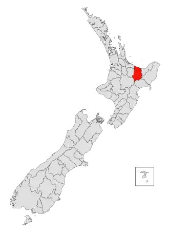 Der Whakatāne District ist seinerseits noch einmal in vier Wards eingeteilt, dem Whakatāne-Ōhope Ward mit vier Councillors (Ratsmitgliedern) und dem Rangitāiki Ward mit drei, dem Tāneatua-Waimana Ward und dem Galatea-Murupara Ward mit je einem Councillors. Zusammen mit dem Mayor (Bürgermeister) bilden sie den District Council (Distriktsrat).[10] Der Bürgermeister und die neun Ratsmitglieder werden alle drei Jahre neu gewählt.