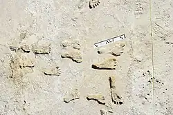 Im Jahr 2009 wurden in einem ausgetrockneten Seebett Fußabdrücke des anatomisch modernen Menschen (Homo sapiens) entdeckt, die 2021 wissenschaftlich beschrieben wurden.[12] Die Datierung von Samen der Wasserpflanze Ruppia cirrhosa in und zwischen den Abdrücken ergab ein Alter von 23.000 Jahren für die Spuren. Diese indirekte Datierung schrieb den Spuren folglich ihr Entstehen nahe dem Höhepunkt der letzten Kaltzeit und damit fast 10.000 Jahre früher zu als bisherige gesicherte Datierungen des Menschen in Nordamerika.[13] Im Januar 2023 wurde die Datierung in Frage gestellt, da Vergleichproben darauf hindeuteten, dass mit dem Wasser des Fundorts altes 14C in den Pflanzenteilen deponiert wurde. Eine Verfälschung der Radiokarbondatierung um ca. 7.000 bis 10.000 Jahre könne daher nicht ausgeschlossen werden; die Spuren wären – sollten diese Einwände zutreffen – nur rund 13.350 Jahre (cal BP) alt.[14] Daraufhin sammelte das ursprüngliche White-Sands-Forscherteam Kiefern-Pollen – also von Landpflanzen – sowie Quarzkristalle aus dem Bereich oberhalb und unterhalb der Fußabdrücke und ließ sie von bislang nicht beteiligten Instituten datieren. Den Analysen zufolge sind die Pollen 23.000 bis 21.000 Jahre alt, die Datierung der Quarzkristalle mit Hilfe der optisch stimulierten Lumineszenz ergab ein Alter von mindestens 21.500 ± 1.900 Jahren.[15] Diese Daten wurden 2025 erneut mit einer methodisch unabhängigen Untersuchung bestätigt[16].