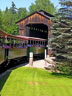 Die Bahn durchquert eine der für die Gegend typischen gedeckten Holzbrücken, die 1904 ursprünglich für die Barre & Chelsea Railroad in Montpelier, Vermont errichtet worden war und 1960 von Clark’s erworben wurde. Alle Teile wurden einzeln nummeriert, und dann zerlegt und 1963 bis 1965 am Ufer wieder aufgebaut. Anschließend wurde sie mit einem alten Lynn Halbkettenfahrzeug an die endgültige Stelle gezogen. Die Brücke ist 36,5 m lang, wiegt 200 Tonnen und hat eine Tragkraft von weiteren 200 Tonnen.[3][1][4]