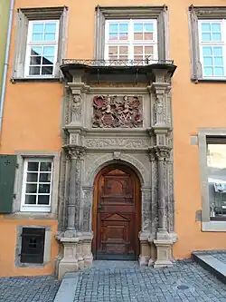 - ↑ Horst Clauss, Hans-Joachim König, Ursula Pfistermeister: Kunst und Archäologie im Kreis Schwäbisch Hall. Theiss, Stuttgart u. a. 1979, ISBN 3-8062-0277-3, Abbildung. 44 (Schwäbisch Hall. Am Markt Nr. 4. Widmannhaus. Portal von 1561) und S. 72.