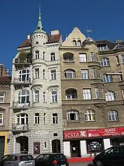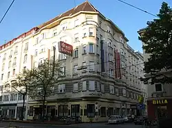 Dieses späthistoristische Wohnhaus wurde 1911/12 von Friedrich Kleibl erbaut. Das schmale Gebäude ist durch burgartige Elemente gekennzeichnet. Im Foyer befinden sich Stuckreliefs mit spielenden Putten. Im Haus war ein Hotel und ein Studentenheim untergebracht, heute befindet sich in den Räumen des ehemaligen Atlantis-Kinos hier seit 1995 das Scala-Theater des Theaters zum Fürchten.