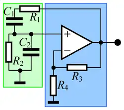 ein Minimum zeigt. Voraussetzung ist, dass die beiden Widerstände und Kondensatoren im Bandpass gleich gewählt werden. Dort findet auch ein Phasensprung von −90° nach +90° statt. Daher kann die Wien-Robinson-Brücke zusammen mit einem Operationsverstärker als Sperrfilter eingesetzt werden. Da keine Spulen benötigt werden, ist der Filter auch für Tonfrequenzen und darunter einsetzbar.