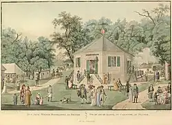 Am 6. Juni 1808 wurde auf der (später danach benannten) Zirkuswiese, südlich der Hauptallee schräg gegenüber dem Dritten Kaffeehaus, der Circus gymnasticus (Zirkus Bach) des k.k. Kunstreiters Christoph de Bach (1768–1834) eröffnet.[9] Das (wahrscheinlich) von Joseph Kornhäusel (1782–1860) entworfene (und ursprünglich in Holz ausgeführte) Gebäude bestand bis 1852.[10] Das Bauwerk, das 1850 zur Lizitation kam und im Mai 1851 von Joseph Freiherrn von Dietrich (1780–1855) im Hinblick auf eine Renovierung ersteigert und kurzzeitig bespielt worden war, musste, gemäß dem durch das Ableben der Erbin, Laura de Bach († 1851),[11] gegenstandslos gewordenen (ehedem von Kaiser Franz II. ausgestellten) Privilegium, bis Ende August 1852 abgebrochen werden.[12]