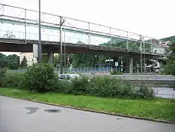 Verbindet den 1858 eröffneten Bahnhof Wien Hütteldorf (vormals Hütteldorf-Hacking) mit Hacking im 13. Bezirk. Ursprünglich ein Holzsteg, ab 1898 ein Steg mit eisernem Tragwerk. 1966 als Plattenbalken-Steg neu errichtet. Von 1993 bis 1994 erfolgte ein Umbau durch die Architekten Henke & Schreieck, wobei der Steg ein Glasdach und beim Bahnhof einen Aufzug erhielt.[9] Dieser Umbau wurde mit dem Adolf-Loos-Staatspreis für Architektur prämiert.[10] 2009 wurde auch am Hackinger Ufer ein Aufzug errichtet. | |