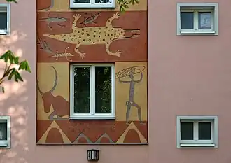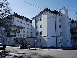 Diese Wohnhausanlage mit mehreren Stiegen wurde 1959/60 von Heinrich Reiter und Brigitte Kiesewetter errichtet. Jede Stiege ist mit einem großen Sgraffito verziert, das afrikanische, indianische, chinesische und Symbole aus der Südsee zeigt. Im Hof befindet sich eine Bronzeplastik Sitzendes Mädchen aus dem Jahr 1963 von Hans Knesl. An der Straßenfront hat Roman Haller ein großes Sgraffito mit ornamentalem Schmuck und dem Spruch Friede in unserem Hause, Friede im Haus nebenan, Friede dem friedlichen Nachbarn, daß jedes gedeihen kann gestaltet.
