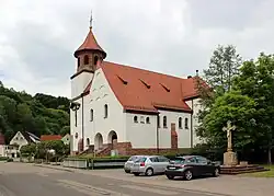 - Sie wurde von 1912 bis 1914 nach Plänen des Architekten Eugen Dünbier (1878–1941) erbaut und weist Elemente von Heimat- und Jugendstil auf. In den 1990er Jahren wurde der in konziliarem Eifer entfernte Hochaltar originalgetreu rekonstruiert. Das Geläut besteht aus drei Glocken in den Tönen fis' – a' – h' von Albert Junker aus Brilon. Sie wurden 1952 als Sonderbronzeglocken gegossen.