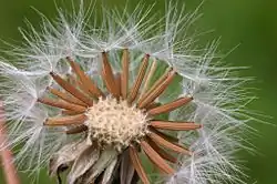 Die Achäne ist 10 bis 13 Millimeter lang, 10- bis 13-rippig, an der Spitze verschmälert, aber ohne Schnabel. Der Pappus ist reinweiß und ragt etwas aus dem Fruchtstand heraus.[1]