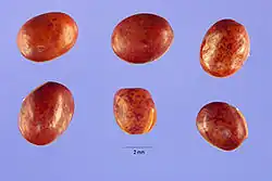 Die meist kahle,[1][7] bei Reife schwarze Hülsenfrucht ist bei einer Länge von meist 2,5 bis 3,5[1] (1,9 bis zu 4,5[5]) Zentimetern sowie einer Breite von 4,8 bis 7 Millimetern[5][7] linealisch[2] oder länglich und flach und enthält selten zwei bis, meist sechs bis zwölf Samen.[5][9] Die gelben oder braunen bis schwarzen, glatten Samen sind bei einer Länge von 2,5 bis 4,5 Millimetern sowie einem Durchmesser von 2,3 bis 3,8 Millimetern mehr oder weniger kugelig.[2][5] Das Hilum ist 1,4 bis 1,5 Millimeter lang.[5]