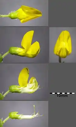 Die zwittrigen[8] Blüten sind bei einer Länge von 10 bis 16, selten bis zu 18 Millimetern zygomorph und fünfzählig mit doppelter Blütenhülle. Die fünf kahlen oder flaumig behaarten, meist 6 bis 9 (4,5 bis 10) Millimeter langen, ungleichen Kelchblätter sind glockenförmig zu einer 2 bis 4 Millimeter langen Kelchröhre verwachsen.[2][5] Der Kelch besitzt 25 bis 35 Nerven.[5] Die fünf Kelchzähne enden spitz und so lang bis länger wie die Kelchröhre.[5] Die oberen Kelchzähne sind bei einer Länge von 2 bis 4, selten bis zu 5 Millimetern sowie einer Breite von 1 bis 2 Millimetern dreieckig oder lanzettlich.[5][6][7] Die mittleren Kelchzähne sind bei einer Länge von selten 2,3 bis, meist 3 bis 5 Millimetern sowie einer Breite von 0,8 bis 1,5 Millimetern dreieckig oder lanzettlich.[5] Die unteren Kelchzähne sind bei einer Länge von 3,3 bis 6,5 Millimetern sowie einer Breite von 1 bis 1,7, selten bis zu 2 Millimetern linealisch-lanzettlich.[5] Die Blütenkrone ist etwa gleich lang wie der Blütenkelch.[5] Die fünf kräftig gelben Kronblätter bilden die typische Form der Schmetterlingsblüte.[5] Die bei einer Länge von 12 bis 20 Millimetern sowie einer Breite von 6,5 bis 13 Millimetern spatelförmige Fahne besitzt eine kreisförmige Platte mit violetten Nerven sowie einen Nagel und ist bewimpert.[2][5] Die Flügel sind mit einer Länge von 1 bis 16 Millimetern sowie einer Breite von 3,5 bis 5,5, selten bis zu 7 Millimetern[5] etwas kürzer als die Fahne.[2] Das Schiffchen ist bei einer Länge von 10 bis 13 Millimetern sowie einer Breite von 2,5 bis 4 Millimetern sichelförmig.[5] Die Staubfadenröhre ist mit einer Länge von 8,5 bis 10 Millimetern gleich bis 1,5-mal oder selten doppelt so lang wie der Blütenkelch.[5] Die Staubbeutel sind 0,5 bis 0,7 Millimeter lang.[5] Das einzige Fruchtblatt ist meist flaumig behaart, seltener kahl und drüsig,[5] Der bei einer Länge von 3,3 bis 4,5 Millimetern längliche[5] Griffel ist im oberen Bereich etwas verbreitert, er ist nicht gedreht und bis über die Mitte hinab bärtig.[9]