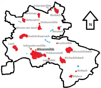 ![]() Lage der Wiesenmühle (fett) im Prichsenstädter Gemeindegebiet