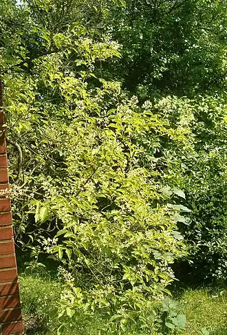 Die Blütezeit reicht in China von Mai bis Oktober. Die seiten- oder endständigen, thyrsenähnlichen, Blütenstände setzen sich aus mehreren bis vielen kleineren Thyrsen zusammen. Sie erreichen eine Länge von 12,5 bis 23,6 (4,5 bis 38) Zentimeter und eine Breite von 4,7 bis 9,3 (2,3 bis 15) Zentimeter.