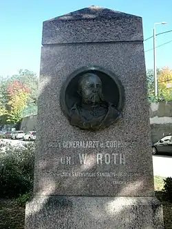 Roth blieb unverheiratet und verstarb nach kurzer, schwerer Krankheit infolge eines Asthmaleidens. Er wurde mit höchsten militärischen Ehren auf dem Inneren Neustädter Friedhof in Dresden beigesetzt.[1] Ihm zu Ehren wurde 1893 zum 60. Geburtstag ein Denkmal im ehemaligen Garnisonslazarett an der Marienallee eingeweiht.[2] Das Bronzemedaillon schuf der Dresdner Bildhauer Heinrich Epler. Die Inschrift lautet: