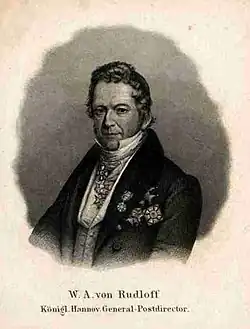 Am 9. April 1824 wurde Wilhelm August Rudloff erst zum Oberpostdirektor, am 22. August 1828 zum Generalpostdirektor des Königreichs Hannover ernannt und am 10. Mai 1838 in den Adelsstand erhoben.[7]