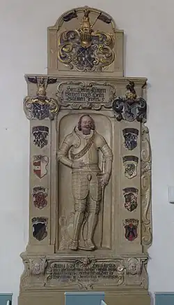 „Anno Domini 1621 den 16. April, starb der Wohlgeborene Herr, Herr WILHELM, des Heiligen Römischen Reichs Erb-Marschall, Herr zu Pappenheim und Gräfenthal, auf Rotenstein, Calden und Berolsheim. Herr deine Augen sehen auf den Glauben! Jerem. V.“