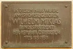 - ↑ Felix Czeike (Hrsg.): Miklas Wilhelm. In: Historisches Lexikon Wien. Band 4, Kremayr & Scheriau, Wien 1995, ISBN 3-218-00546-9, S. 264 (Digitalisat, Eintrag im Wien Geschichte Wiki der Stadt Wien).