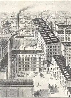 1861 zog Wilhelm Riedel nach Berlin. Hier war er zunächst in der Georgenkirchstraße tätig. Später mietete er die Gebäude einer ehemaligen Silberschmelze in der Brunnenstraße 123.[15] 1864 starb seine Mutter.[16] Sein Stiefvater fiel nun durch übermäßigen Alkoholkonsum auf und war nicht mehr in der Lage, den Peitzer Betrieb ordentlich zu leiten. So verkaufte Riedel auch die übrig gebliebene Appretur in Peitz.[17] In den kommenden Jahren konnte er sein Geschäft weiter ausbauen. Zunächst erweiterte er seine Fabrik in der Brunnenstraße um eine Walkerei und eine Färberei.[17] 1868 erwarb er das Just’sche Geschäft in der Neuen Königsstraße 30 und schloss einen zehnjährigen Pachtvertrag über die Fabrikräume.[18] Da die dortige Färberei jedoch nur fleckige Ware erzeugte, suchte er nach einem neuen Standort und fand ihn in der Köpenicker Straße 50.[19] Das Grundstück lag direkt an der Spree. Dadurch konnte er das weiche Wasser der Spree nutzen und damit Geld sparen. Konkurrenten, die nicht an der Spree gebaut hatten, mussten Leitungswasser kaufen, da Brunnenwasser zu hart war.[20] Das für den Erwerb des Grundstücks notwendige Kapital erwirtschaftete er unter anderem mithilfe der Deckenproduktion für die Preußische Armee im Deutsch-Französischen Krieg. Die Stoffe dafür brachten auch ungefärbt denselben Preis wie gefärbte Stoffe ein und waren damit ein gutes Geschäft.[19] Die neue Färberei konnte am 13. Juli 1871 eröffnet werden.[21] Sie war vom Maurermeister Gause gebaut worden, der der Nachbar Riedels in der Neuen Königsstraße sowie sein väterlicher Freund war.[21] Nachdem der Eigentümer von Riedels Grundstück in der Neuen Königsstraße dieses an eine Aktiengesellschaft verkauft hatte, drohte Riedel die Zwangsräumung seiner Fabrik. Der zehnjährige Pachtvertrag war nur mündlich vereinbart worden. Aus diesem Grund benötigte Riedel eine neue Fabrik, um die 132 Maschinen unterzubringen. Das Geld dafür konnte er jedoch nicht aufbringen. Daraufhin half ihm sein Freund Gause, der ihm die Fabrik für eine kleine Anzahlung auf dem Grundstück in der Köpenicker Straße baute. Sie konnte im Juli 1873 eröffnet werden.[21]